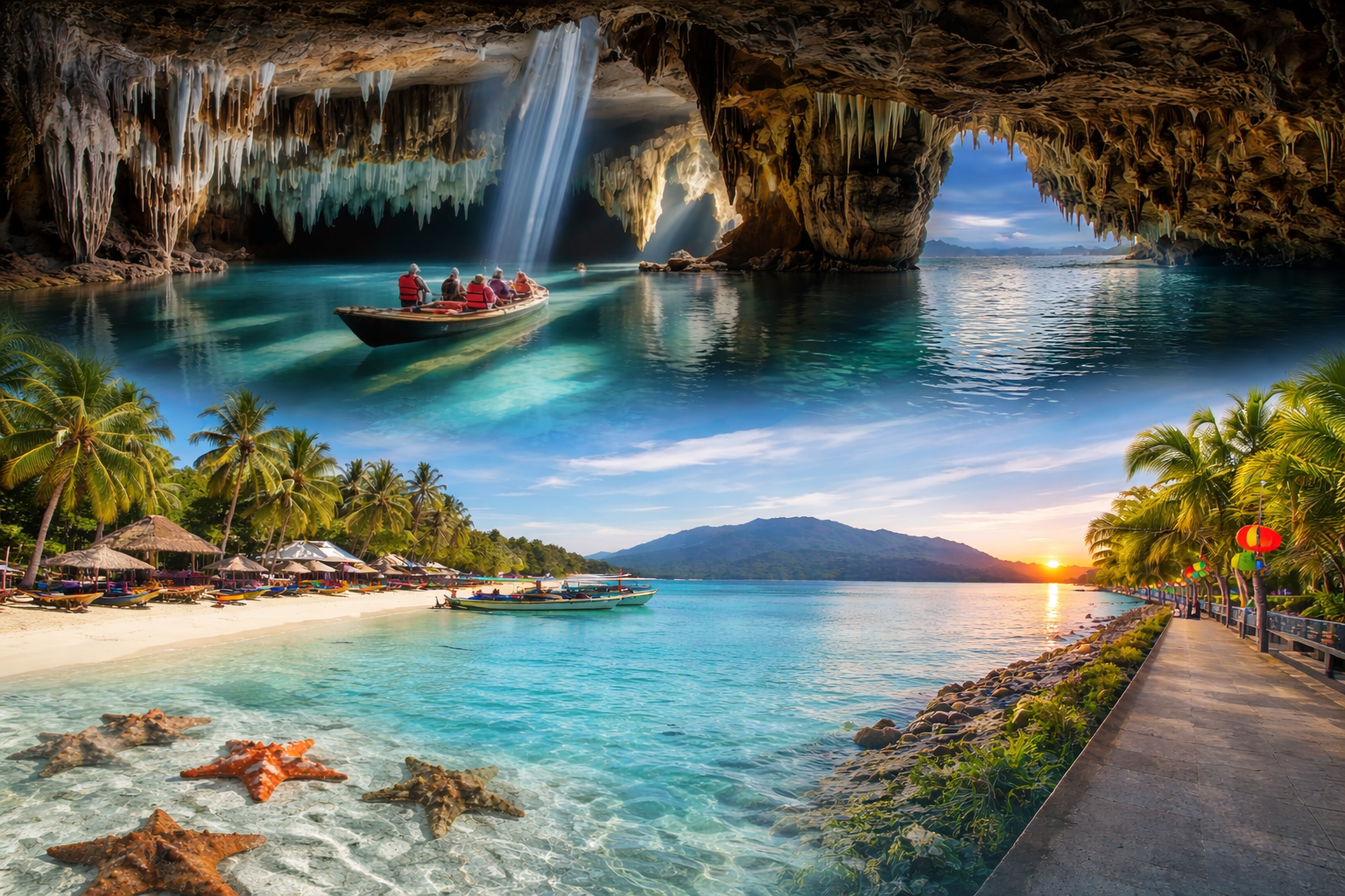 Adventure seekers can also explore the breathtaking Puerto Princesa Underground River, one of the most famous natural attractions in the Philippines, and enjoy island escapes across Honda Bay, including Starfish Island, Luli Island, and Cowrie Island, offering crystal-clear waters and tropical island scenery.